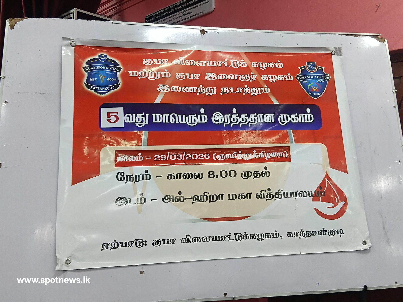 காத்தான்குடி பகுதியில் சமூக நலச் செயற்பாடுகளில் ஈடுபட்டு வரும் குபா விளையாட்டுக் கழகம் மற்றும் குபா இளைஞர் கழகம் இணைந்து ஏற்பாடு செய்த 5வது மாபெரும் இரத்ததான முகாம் இன்று (29) ஞாயிற்றுக்கிழமை அல்-ஹிறா மகா வித்தியாலய வளாகத்தில் நடைபெற்றது.