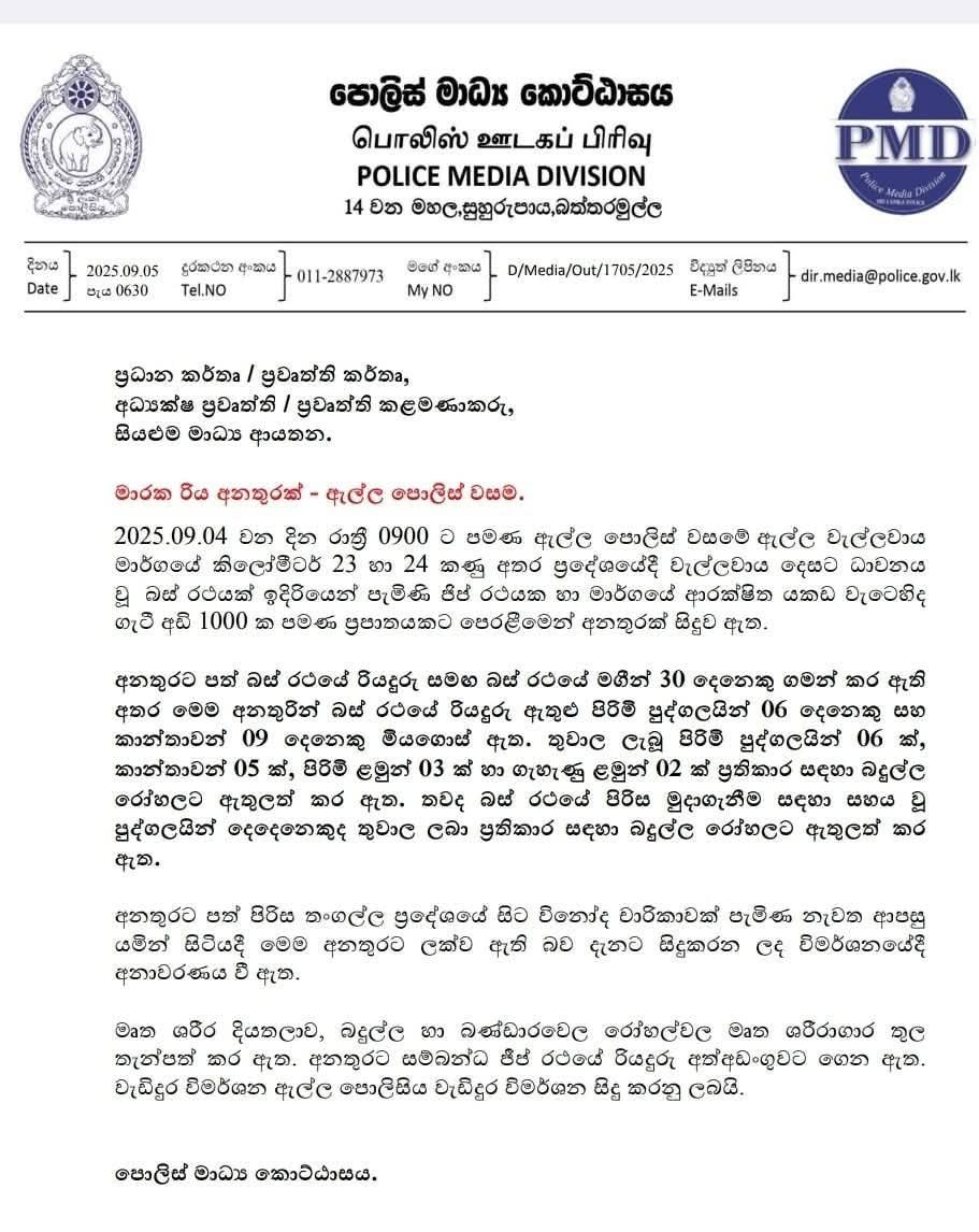 இந்த பேருந்து தங்காலை நகரசபை பணியாளர்கள் குழுவை ஏற்றிச் சென்றதாகவும் தெரியவந்துள்ளது.