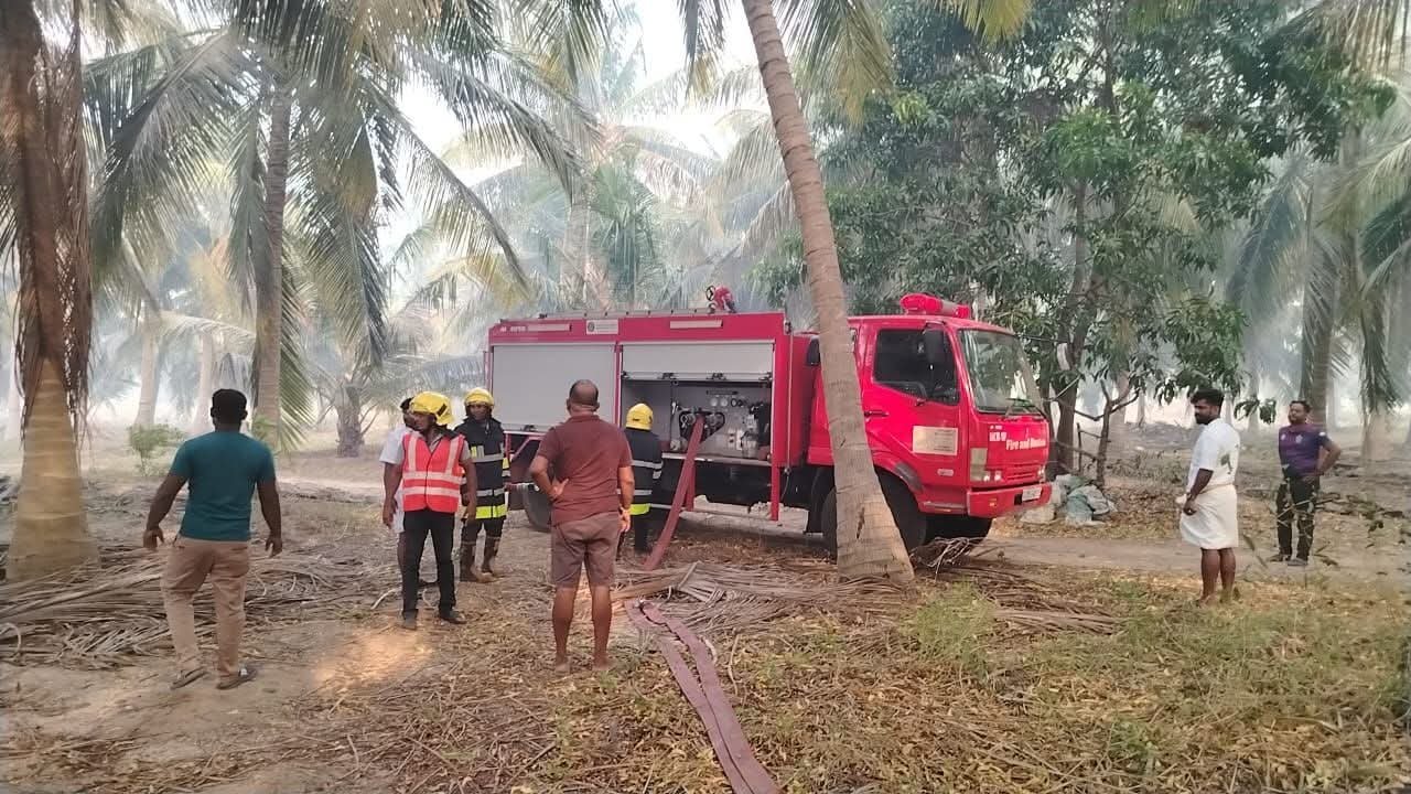 இந்த தீ சம்பவத்தில் பல தென்னை மரங்கள் தீயில் கருகி சேதமாகியுள்ளனர்.