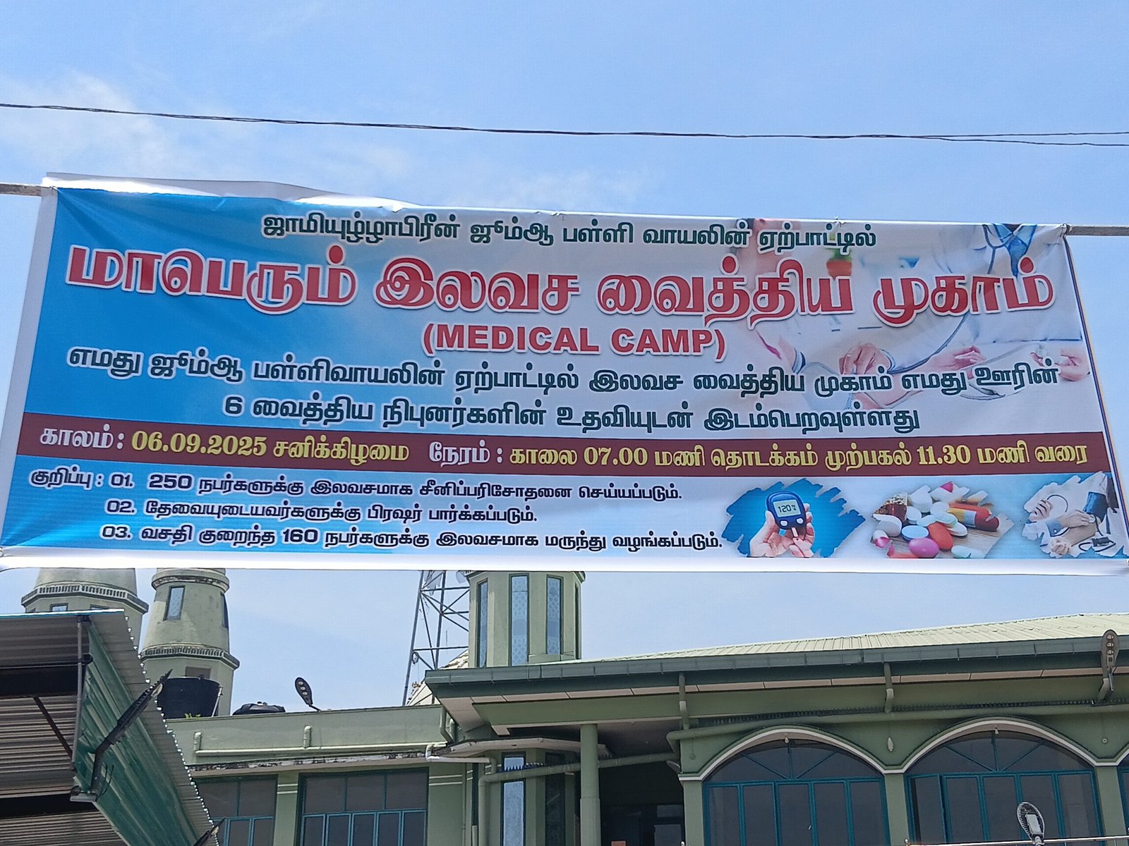 ஜாமியுழ்ழாபிரீன் ஜும்ஆப் பள்ளிவாயலின் ஏற்பாட்டில்; மாபெரும் இலவச மருத்துவ முகாம்.!!!