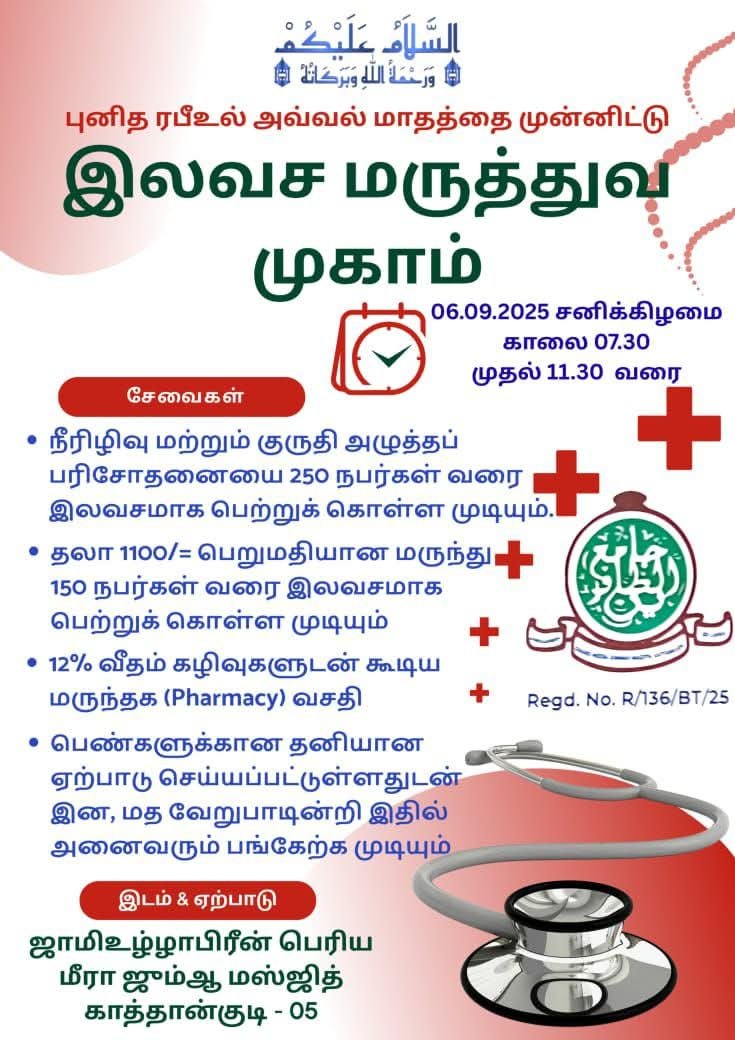 புனித ரபீஉல் அவ்வல் மாதத்தை முன்னிட்டு, காத்தான்குடி ஜாமியுழ்ழாபிரீன் பெரிய மீரா ஜும்ஆப் பள்ளிவாயலின் ஏற்பாட்டில், பிரதேச மக்களின் மருத்துவ நலனைக் கருத்தில் கொண்டு மாபெரும் இலவச வைத்திய முகாம் நாளை (06) சனிக்கிழமை காலை 7.00 மணி முதல் 11.30 மணி வரை பள்ளிவாயல் மண்டபத்தில் நடைபெறவுள்ளது.