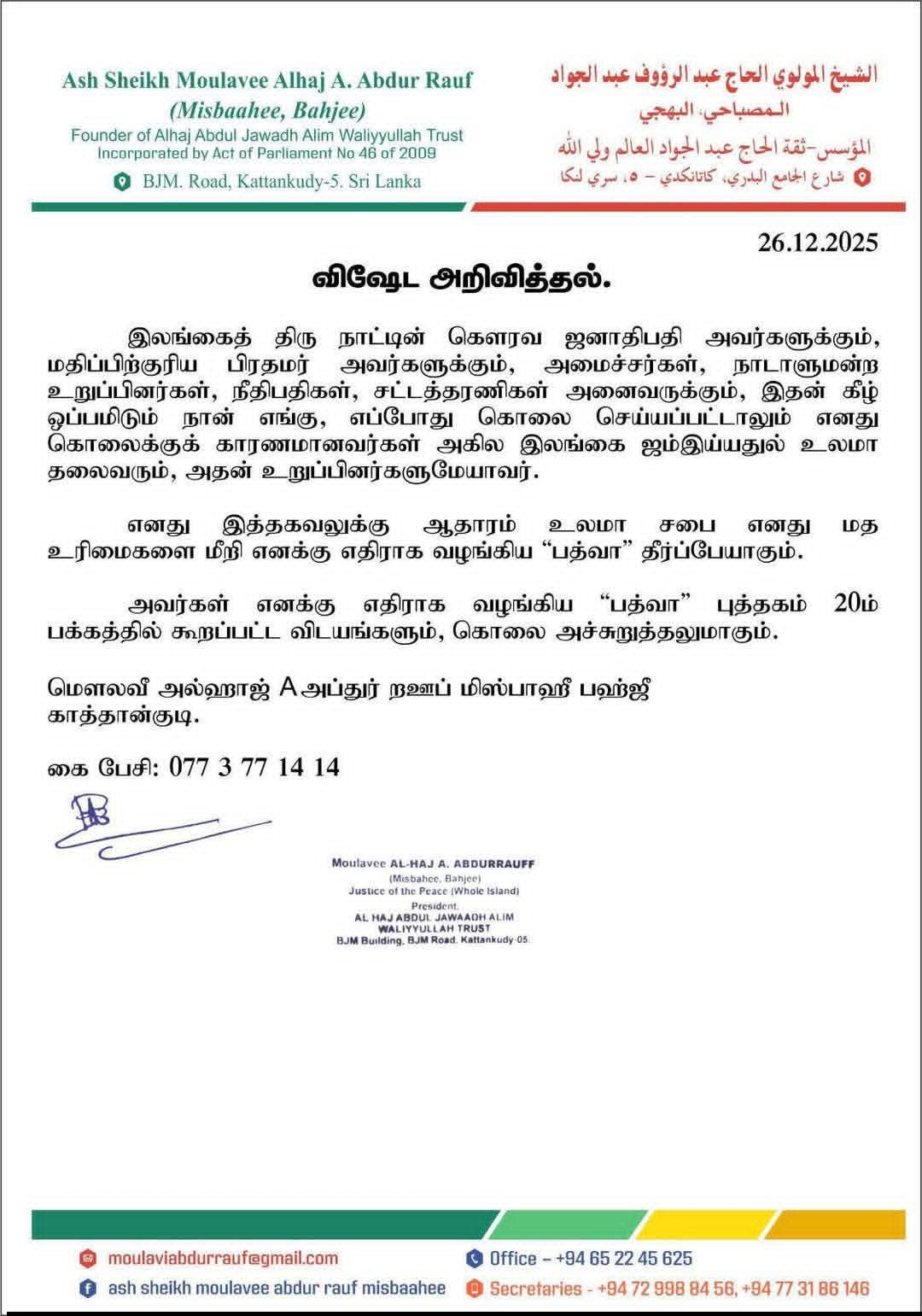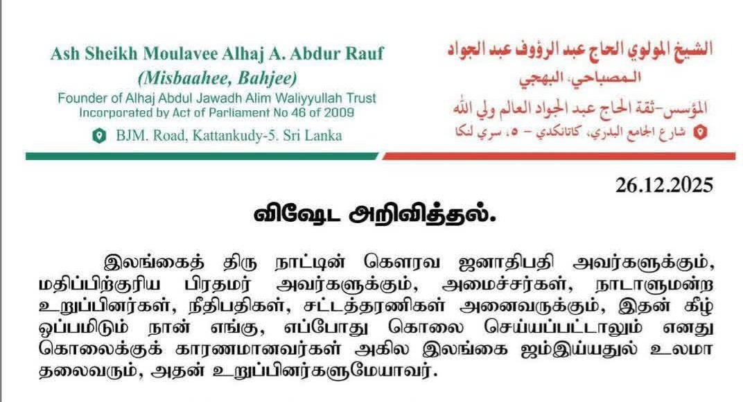 இலங்கைத் திரு நாட்டின் கௌரவ ஜனாதிபதி அவர்களுக்கும், மதிப்பிற்குரிய பிரதமர் அவர்களுக்கும், அமைச்சர்கள், நாடாளுமன்ற உறுப்பினர்கள், நீதிபதிகள், சட்டத்தரணிகள் அனைவருக்கும், இதன் கீழ் ஒப்பமிடும் நான் எங்கு, எப்போது கொலை செய்யப்பட்டாலும் எனது கொலைக்குக் காரணமானவர்கள் அகில இலங்கை ஜம்இய்யதுல் உலமா தலைவரும், அதன் உறுப்பினர்களுமேயாவர்.