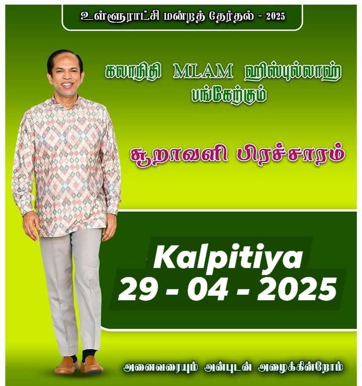 ஸ்ரீ லங்கா முஸ்லிம் காங்கிரஸ் கட்சியின் கற்பிட்டி நகர வட்டார வேட்பாளர்களை ஆதரித்து இடம்பெறும் பிரச்சார மேடை இன்று செவ்வாய்க்கிழமை (29) மாலை 06 மணிக்கு கற்பிட்டியில் முஸ்லிம் காங்கிரஸின் கற்பிட்டி அமைப்பாளரும் உயர்பீட உறுப்பினருமான எம் எச் எம் ஹில்மி தலைமையில் இடம்பெற உள்ளது..