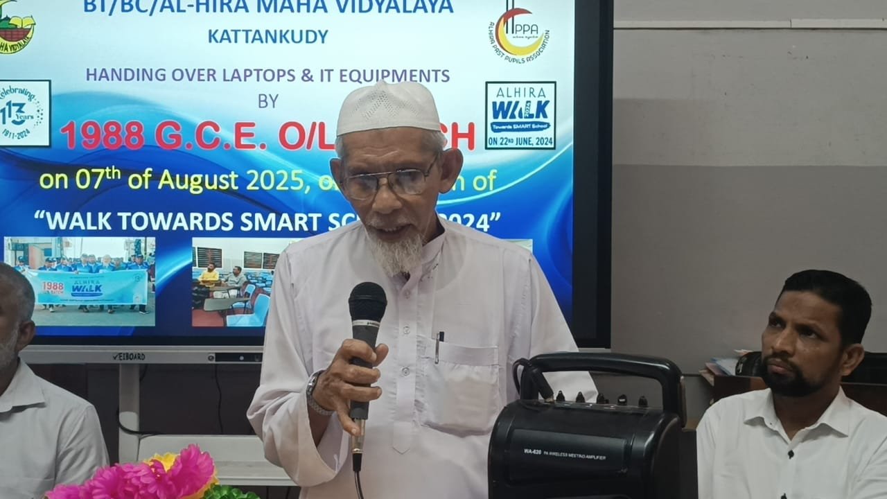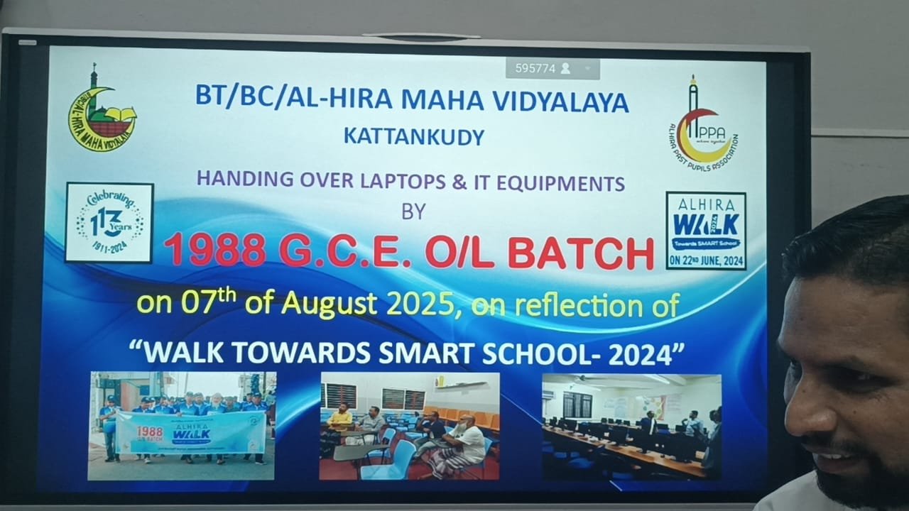 காத்தான்குடி மட்/மம/அல் ஹிறா மகா வித்தியாலயத்தின் 1988 க.பொ.த (சா/த) பழைய மாணவர்களினால் பாடசாலை மாணவர்களின் கல்வி மட்டத்தை அதிகரிக்கும் நோக்கில் 10 மடிக்கணினிகள் மற்றும் தொழிநுட்ப உபகரணங்கள் வழங்கும் நிகழ்வு வியாழக்கிழமை( 07) பாடசாலையில் நடைபெற்றது.