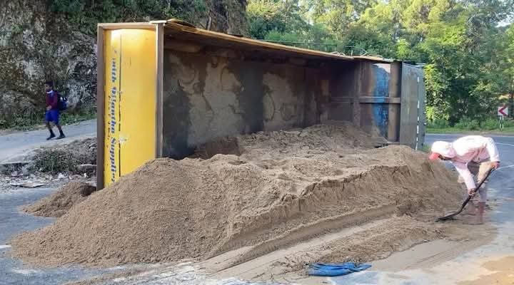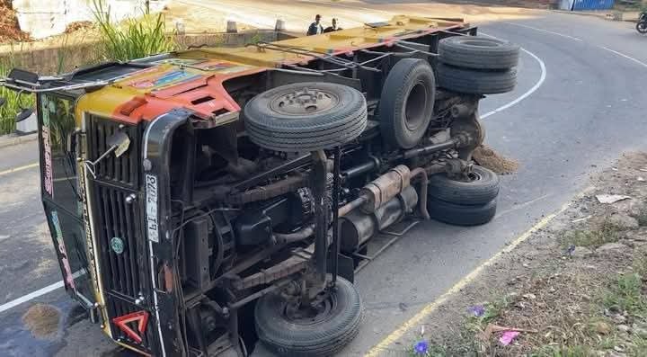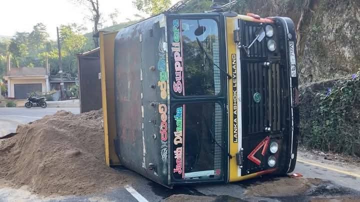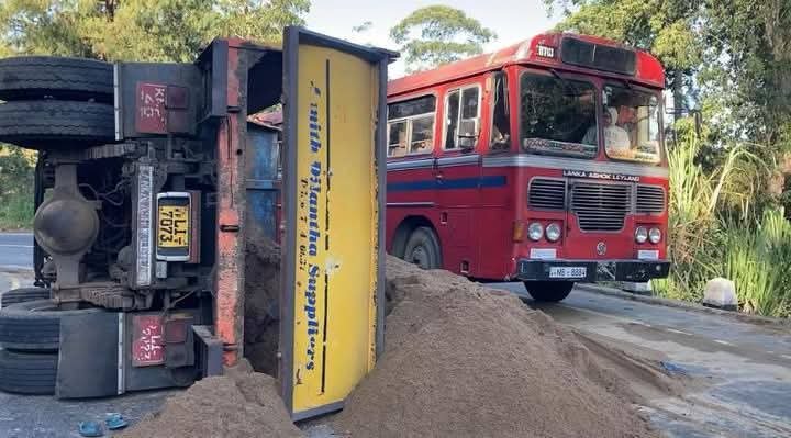 கட்டுப்பாட்டை இழந்து வீதியில் சரிந்த மணல் லொறி; போக்குவரத்து பாதிப்பு.!!!