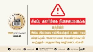 சிவப்பு எச்சரிக்கை நிலைமைகளுக்கு மத்தியில் – அகில இலங்கை ஜம்இய்யத்துல் உலமா சபை விடுக்கும் அவசரகால வேண்டுகோள் மற்றும் பாதுகாப்பு வழிகாட்டல்கள்.!!!