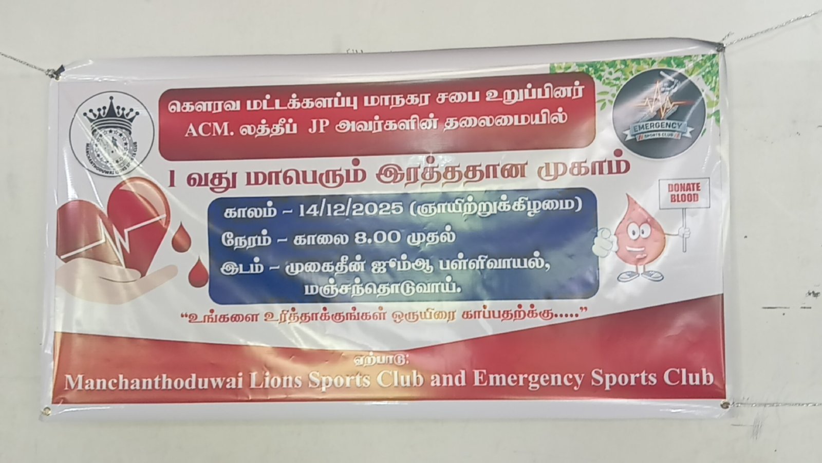 மஞ்சந்தொடுவாய் லயன்ஸ் விளையாட்டு கழகம் மற்றும் எமர்ஜென்ஸி விளையாட்டு கழகம் இணைந்து ஏற்பாடு செய்த 1ஆவது மாபெரும் இரத்ததான முகாம், இன்று (14) ஞாயிற்றுக்கிழமை மஞ்சந்தொடுவாய் முகைதீன் ஜும்ஆ பள்ளிவாசல் வளாகத்தில் மட்டக்களப்பு மாநகர சபை உறுப்பினர் ஏ.சி.எம். லத்தீப் தலைமையில் இடமபெற்றது.