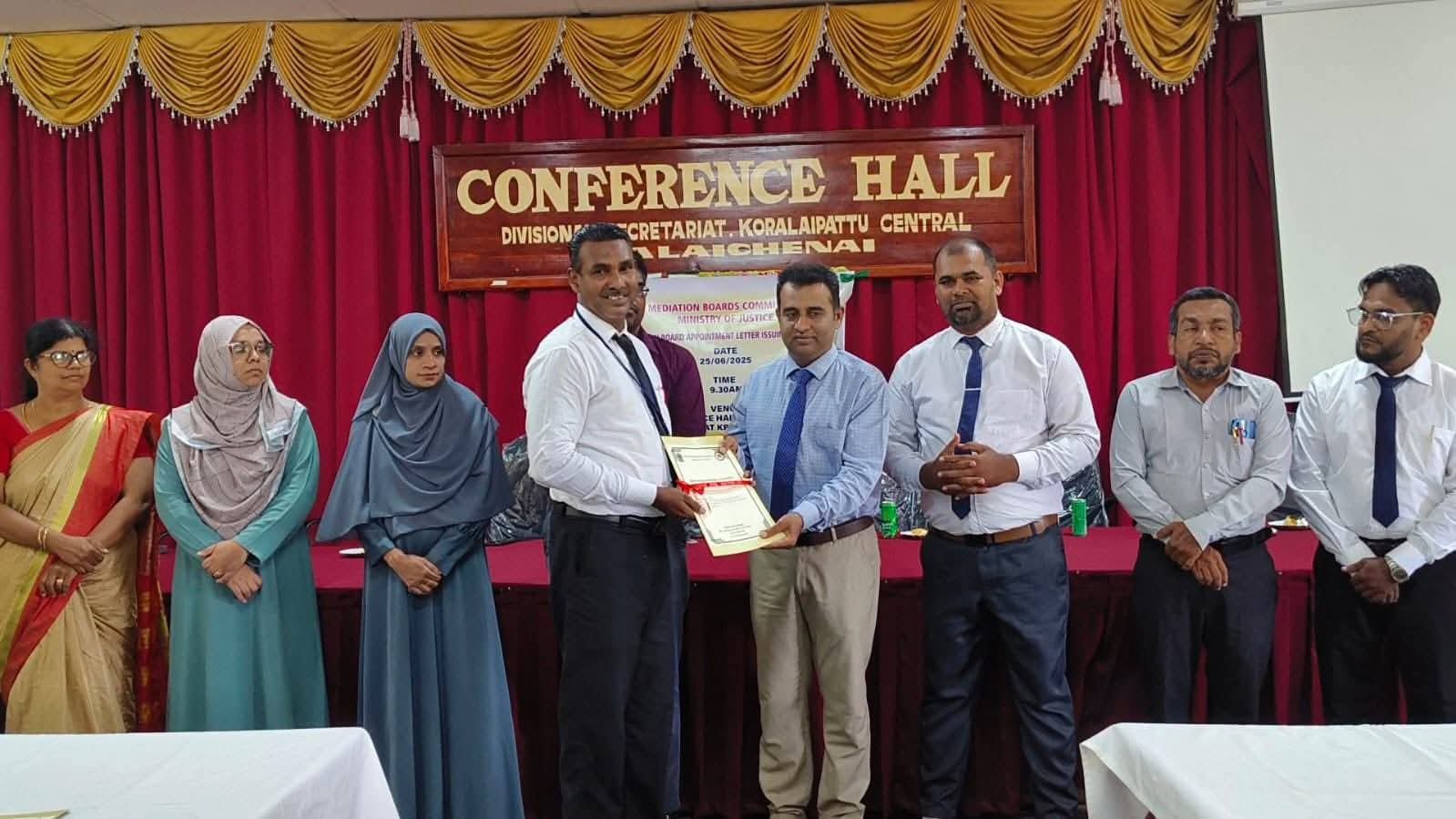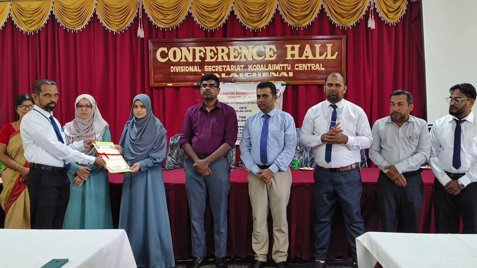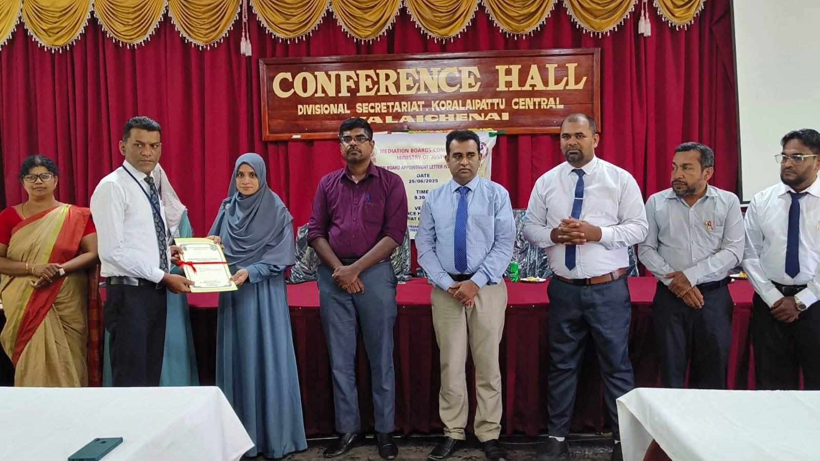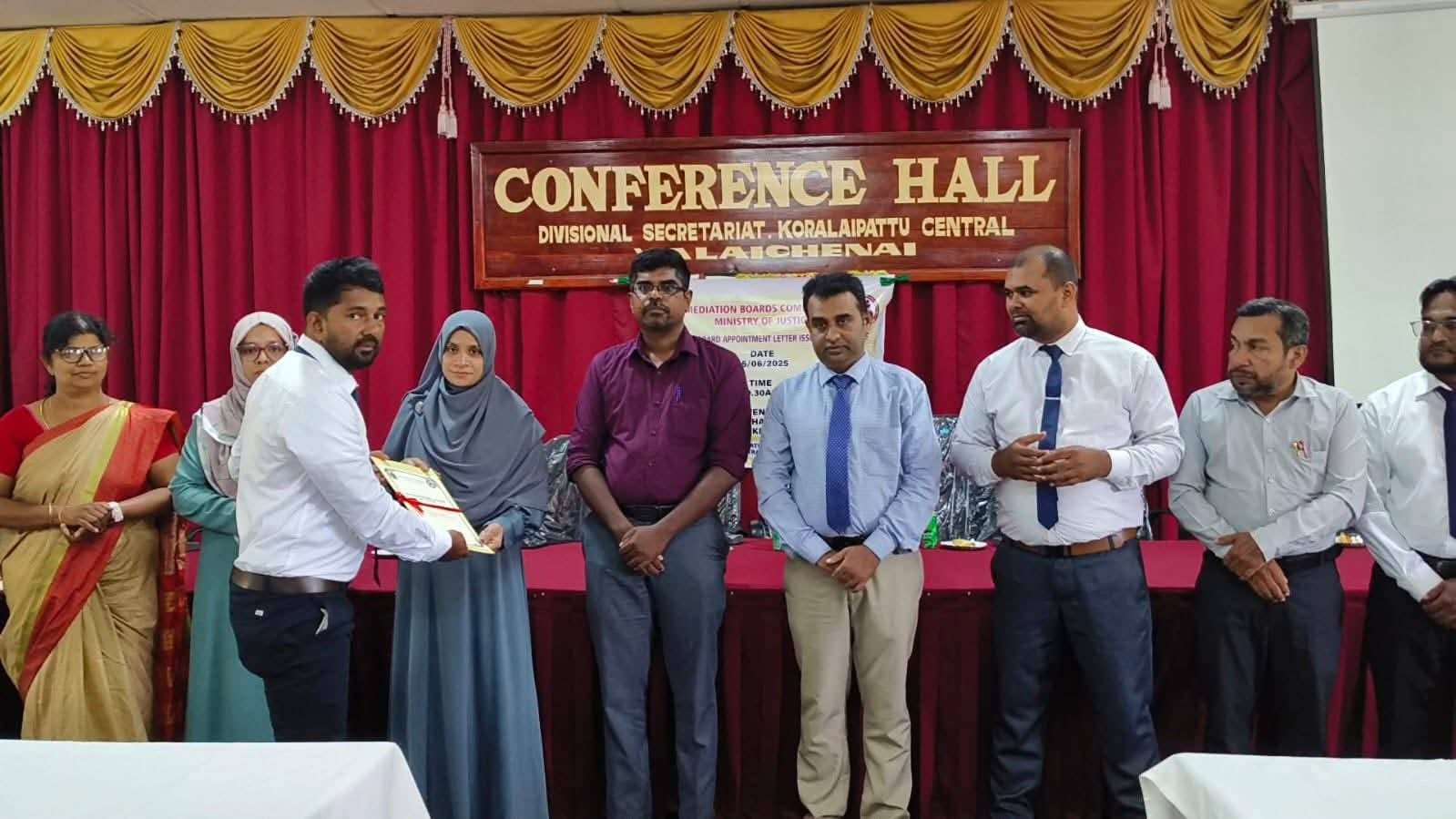 கோறளைப்பற்று மத்தி, வாழைச்சேனை பிரதேச செயலகப்பிரிவின் மத்தியஸ்த சபைக்காக புதிதாக தெரிவு செய்யப்பட்ட 21 உறுப்பினர்களுல் தவிசாளர், பிரதித்தவிசாளர் மற்றும் ஏனைய உறுப்பினர்களுக்கான நியமனக்கடிதங்கள் வழங்கும் நிகழ்வு இன்று 2025/06/25ம் திகதி புதன்கிழமை 9.30 மணிக்கு செயலகத்தின் மாநாட்டு மண்டபத்தில் இடம்பெற்றது.