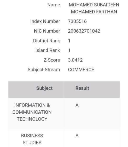 தகவல் மற்றும் தொடர்பாடல் தொழில்நுட்பம், வணிகக் கல்வி மற்றும் கணக்கியல் ஆகிய மூன்று பாடங்களிலும் ‘A’ சித்தி பெற்ற இவர், 3.0412 என்ற உயர்ந்த Z-Score புள்ளிகளைப் பெற்று இந்த சிறப்பான சாதனையை எட்டியுள்ளார்.