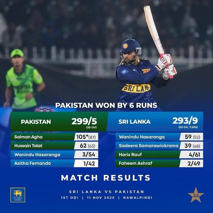 இலங்கை மற்றும் பாகிஸ்தான் அணிகளுக்கிடையிலான முதலாவது ஒருநாள் கிரிக்கெட் போட்டியில், பாகிஸ்தான் அணி 6 ஓட்டங்கள் வித்தியாசத்தில் இலங்கையை வீழ்த்தி வெற்றியைப் பெற்றுள்ளது.