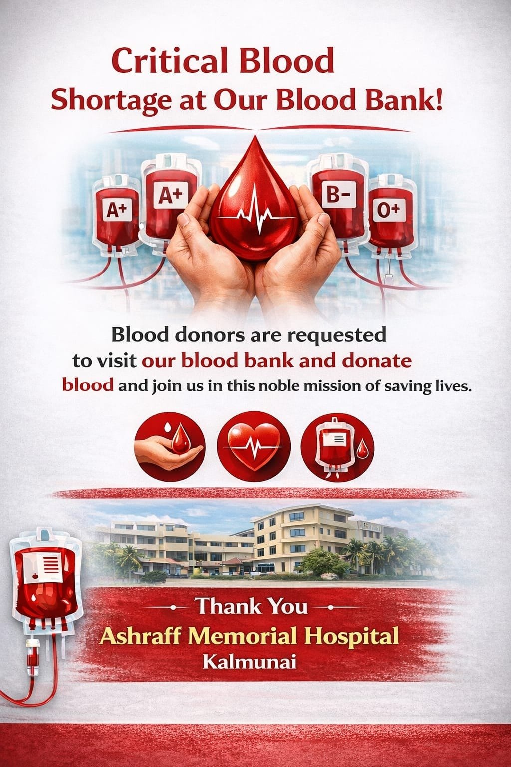 இந்த அவசர நிலையை முன்னிட்டு, இரத்த தானம் செய்யத் தகுதியுடைய பொதுமக்கள் அனைவரும் உடனடியாக இரத்த வங்கிக்கு நேரில் வருகை தந்து தங்களின் இரத்த தானத்தை வழங்குமாறு அன்புடன் கேட்டுக்கொள்ளப்பட்டுள்ளது.