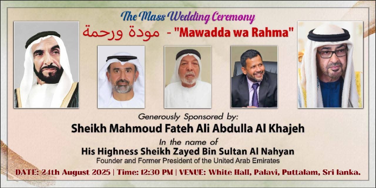 ஐக்கிய அரபு அமீரகத்தின் மறைந்த ஸ்தாபகத் தலைவர் ஷேக் சயீத் பின் சுல்தான் அல் நஹ்யான் அவர்களின் நினைவாக, ஒரே நேரத்தில் 20 ஜோடிகளுக்குத் திருமணம் செய்து வைக்கும் நிகழ்வு புத்தளம், பாலாவி, நாகவில்லுவ வைட் மண்டபத்தில் நடைபெற்றது.
