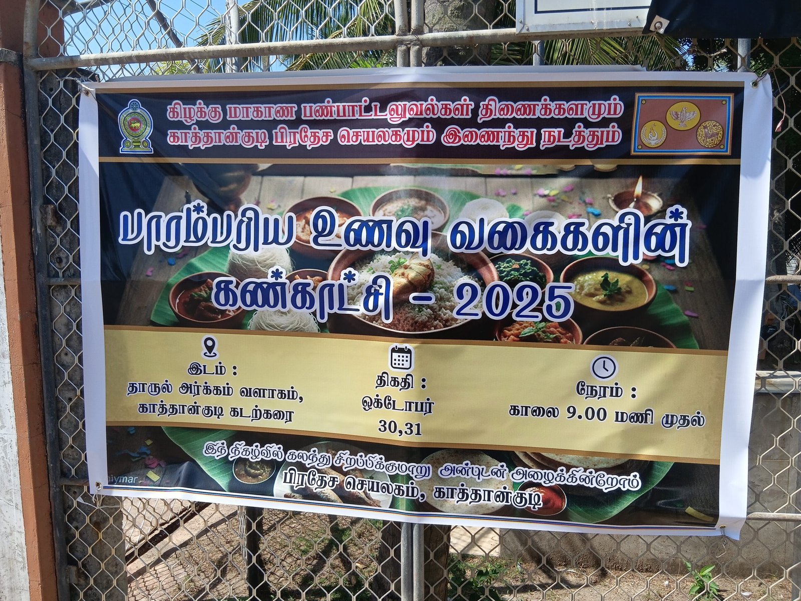 கிழக்கு மாகாண பண்பாட்டலுவல்கள் திணைக்களமும், காத்தான்குடி பிரதேச செயலகமும் இணைந்து ஏற்பாடு செய்த “பாரம்பரிய உணவு வகைகளின் கண்காட்சி – 2025” நிகழ்வு இன்று (30) காத்தான்குடி கடற்கரை பகுதியில் அமைந்துள்ள தாருல் அர்க்கம் வளாகத்தில் ஆரம்பித்து வைக்கப்பட்டது.