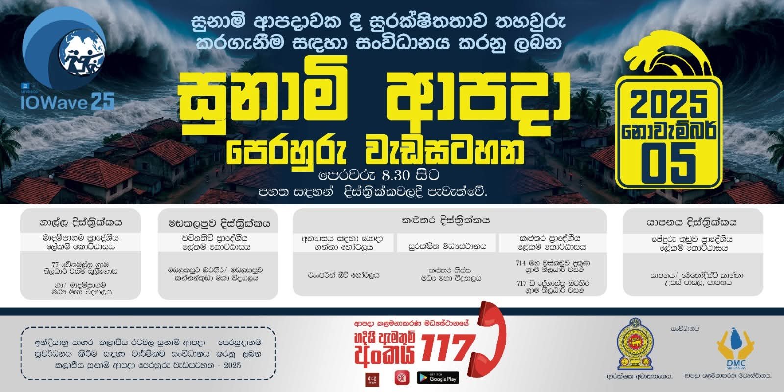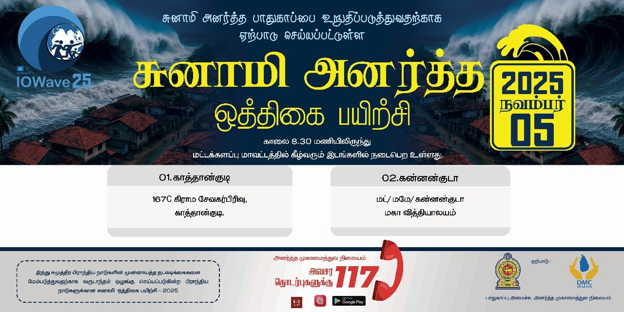 இதற்கமைவாக சுனாமி எச்சரிக்கை ஒத்திகை மட்டக்களப்பு மாவட்டம் உட்பட நாட்டின் 5 மாவட்டங்களில் இடம்பெறுகின்றன. இதனடிப்படையில் மட்டக்களப்பு மாவட்டத்திற்கான சுனாமி ஒத்தினை காத்தான்குடி பிரதேச செயலகப் பிரிவின் 167சீ கிராம சேவகர் பிரிவிலும், மண்முனை தென்மேற்கு பிரதேச செயலகப் பிரிவின் கண்ணங்குமா மகாவித்தியாலயத்திலும் நாளை 05.11.2025 புதன்கிழமை காலை 8.30 மணிக்கு இடம்பெறவுள்ளது.